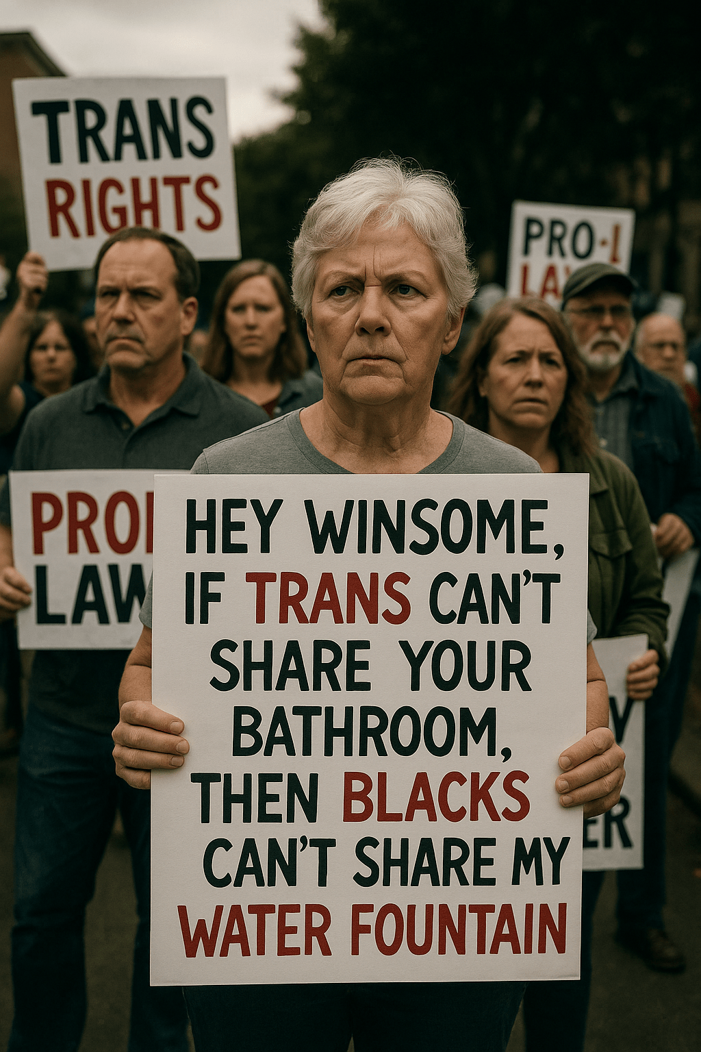 In August, outside an Arlington County School Board meeting in Virginia, a small protest formed over a proposal to restrict transgender students from using bathrooms that do not align with their biological sex. Among the counter-protesters stood a man holding a hand-drawn sign that read, “Hey Winsome, if trans can’t share your bathroom, then Blacks can’t share my water fountain.”